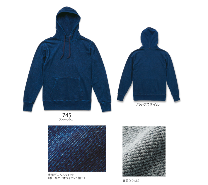 デニムカラーの個性派パーカ。